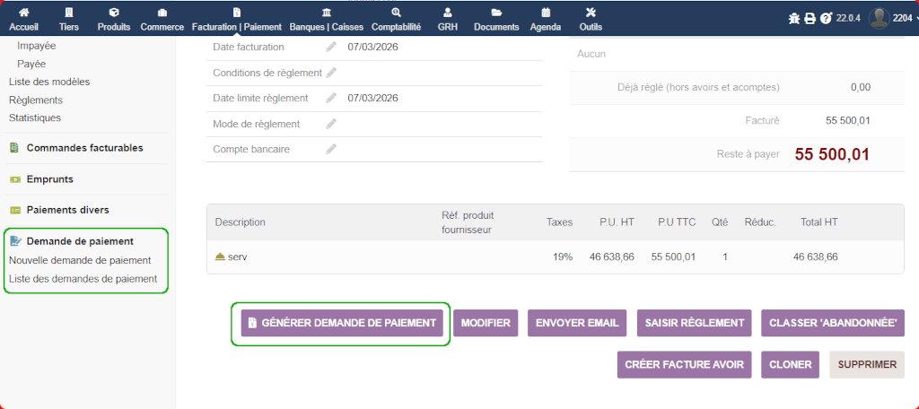 Dieses Modul wurde entwickelt, um die Arbeit des Leiters der allgemeinen Dienste zu erleichtern, indem es die Erstellung und Verwaltung von Zahlungsanforderungen ermöglicht und gleichzeitig die Verfolgung von Rechnungen und Lieferantenverbindlichkeiten verbessert.