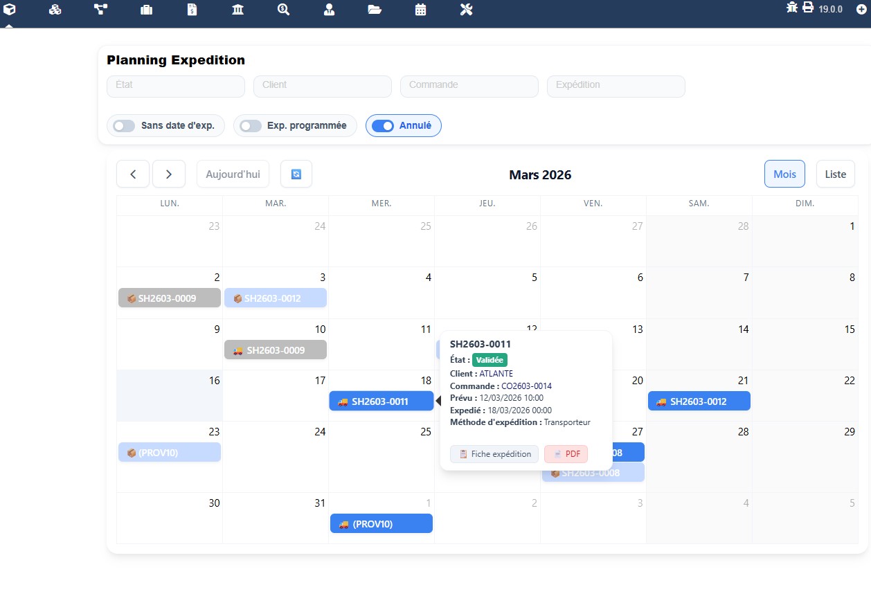 This module adds an interactive shipping calendar to manage your logistics at a glance. View your shipments in menu or list view, quickly identify information using customizable color codes, and modify shipping dates directly from the calendar.
