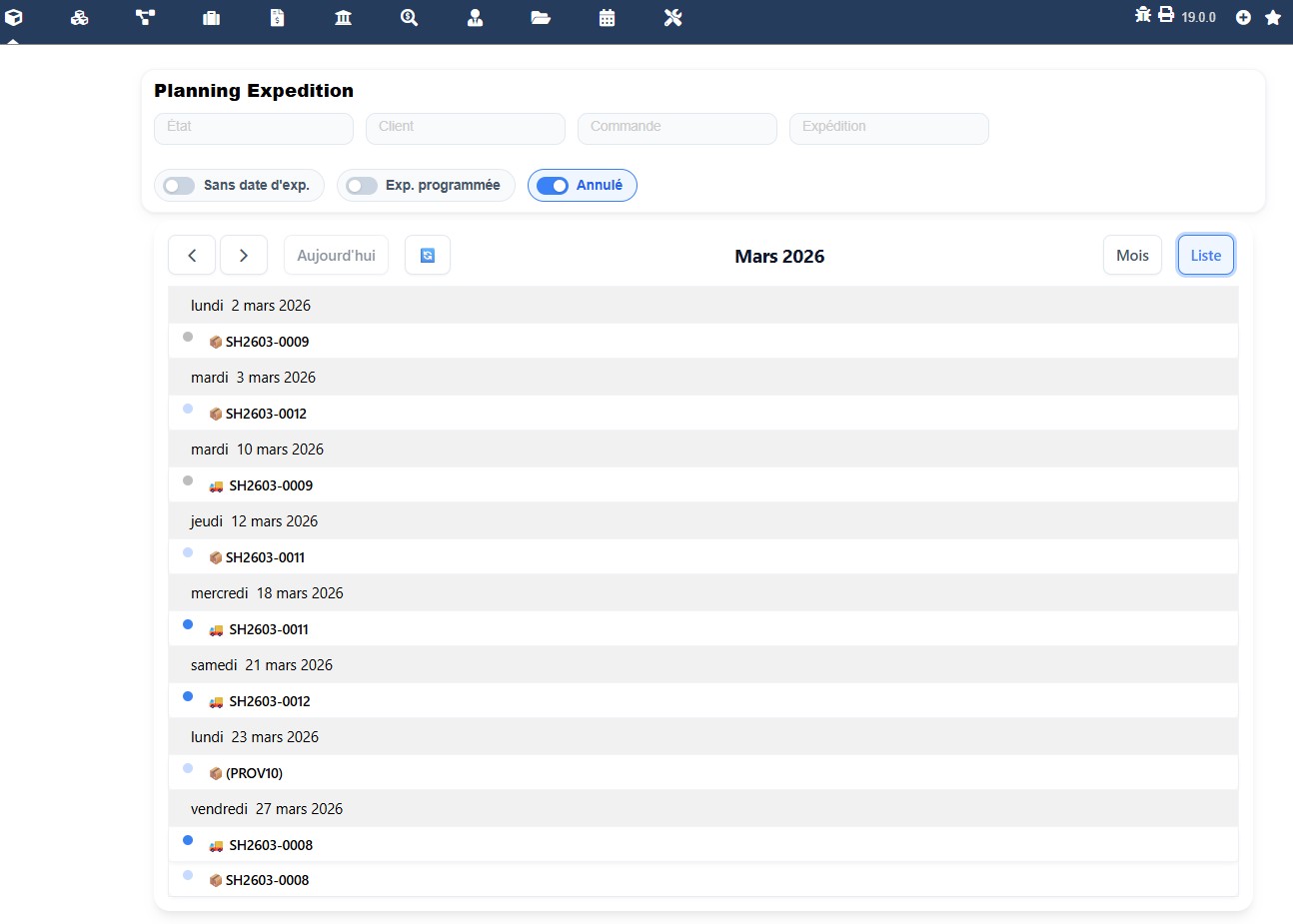 With advanced filters, display only relevant shipments (scheduled, undated, canceled, by customer, order, or period). Each shipment appears with its shipping and delivery dates for complete logistics tracking.