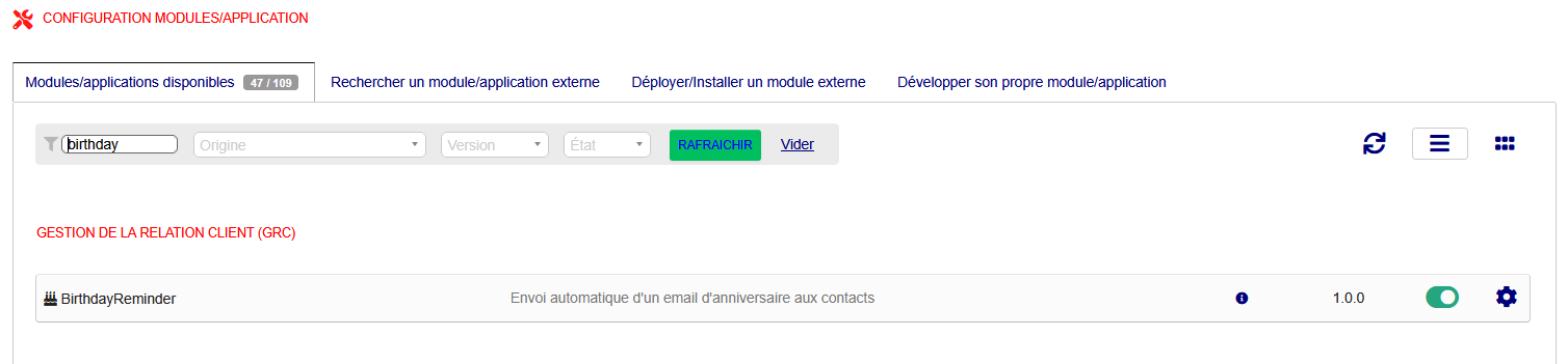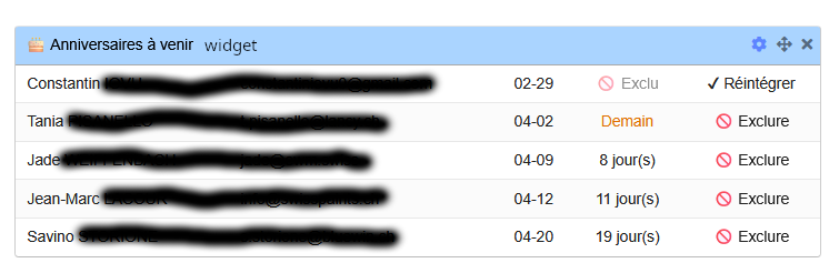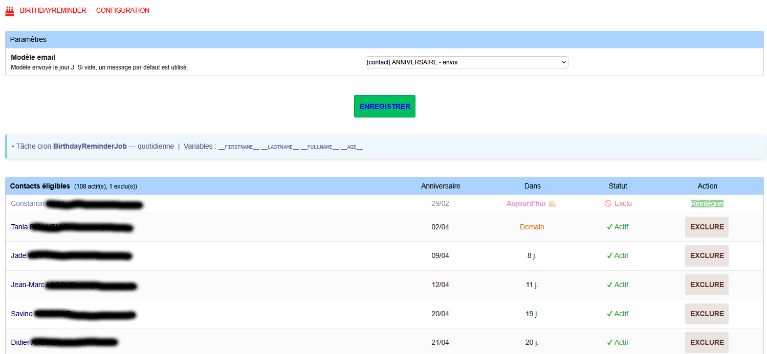 BirthdayReminder détecte chaque jour les contacts dont c'est l'anniversaire et leur envoie automatiquement un email personnalisé. Le modèle email est entièrement configurable depuis les templates natifs Dolibarr. Un widget sur le tableau de bord affiche les 5 prochains anniversaires avec la possibilité d'exclure individuellement chaque contact (opt-out). Un système anti-doublon garantit un seul envoi par an et par contact.