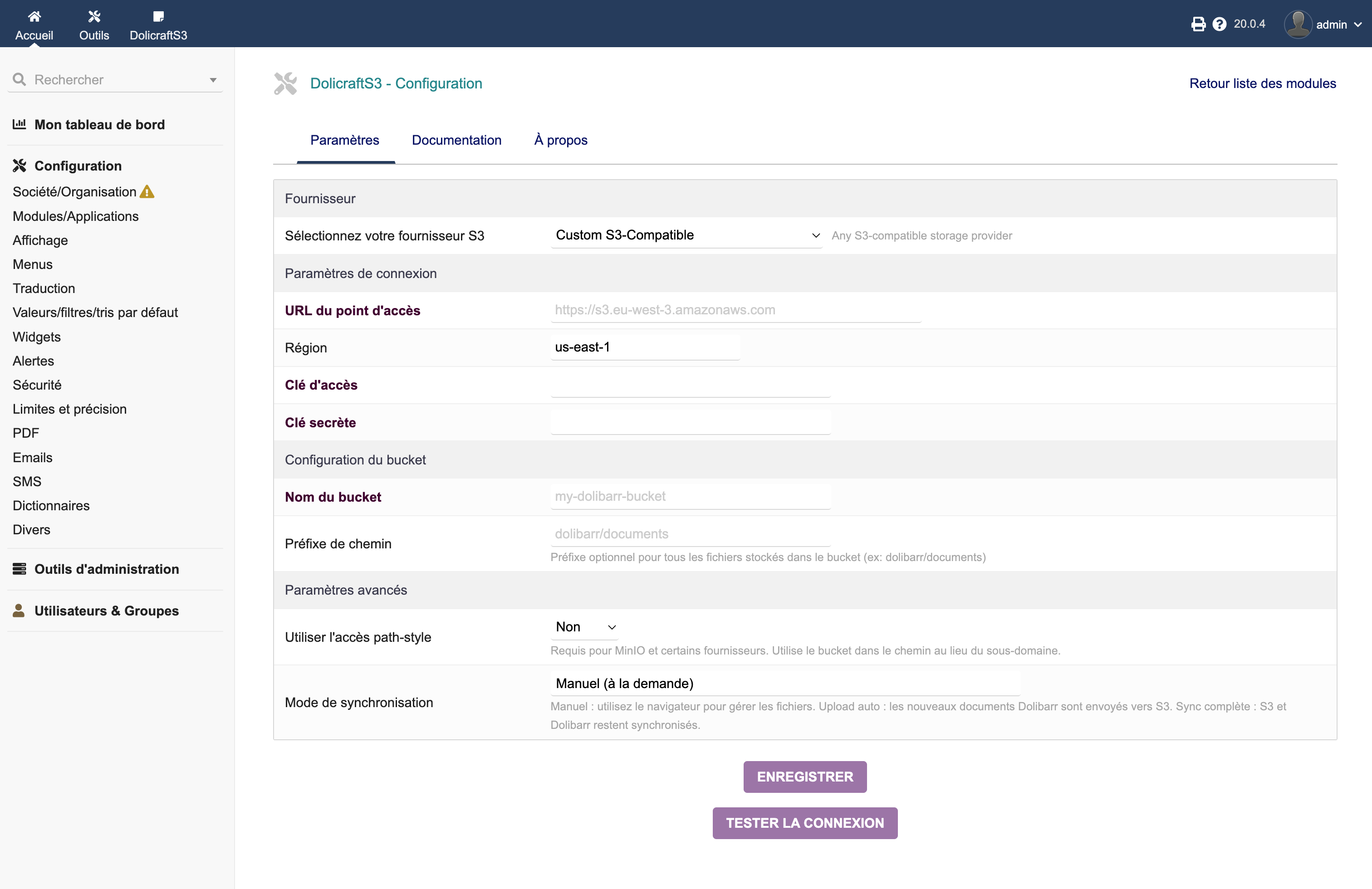 Connect your Dolibarr to any S3-compatible cloud storage: AWS S3, OVH, Scaleway, Wasabi, MinIO, DigitalOcean Spaces, Backblaze B2, Cloudflare R2. Native PHP - no SDK required. Browse, upload, download and sync your files directly from Dolibarr.