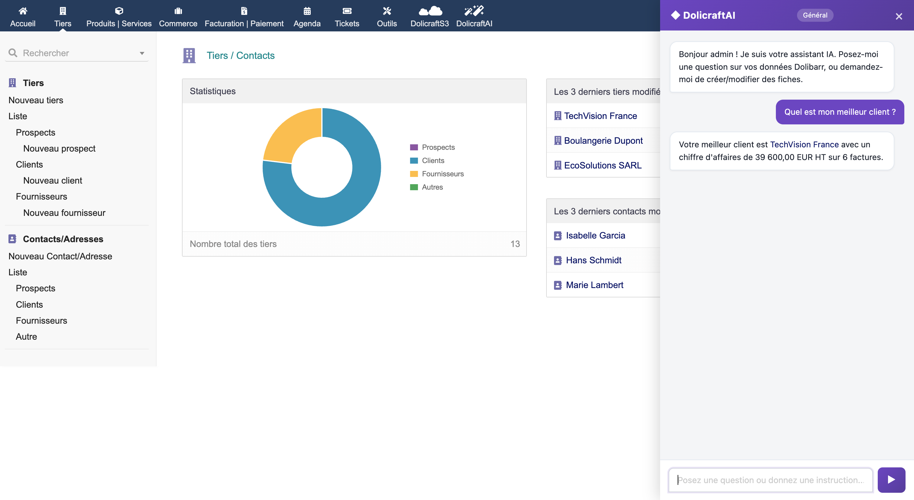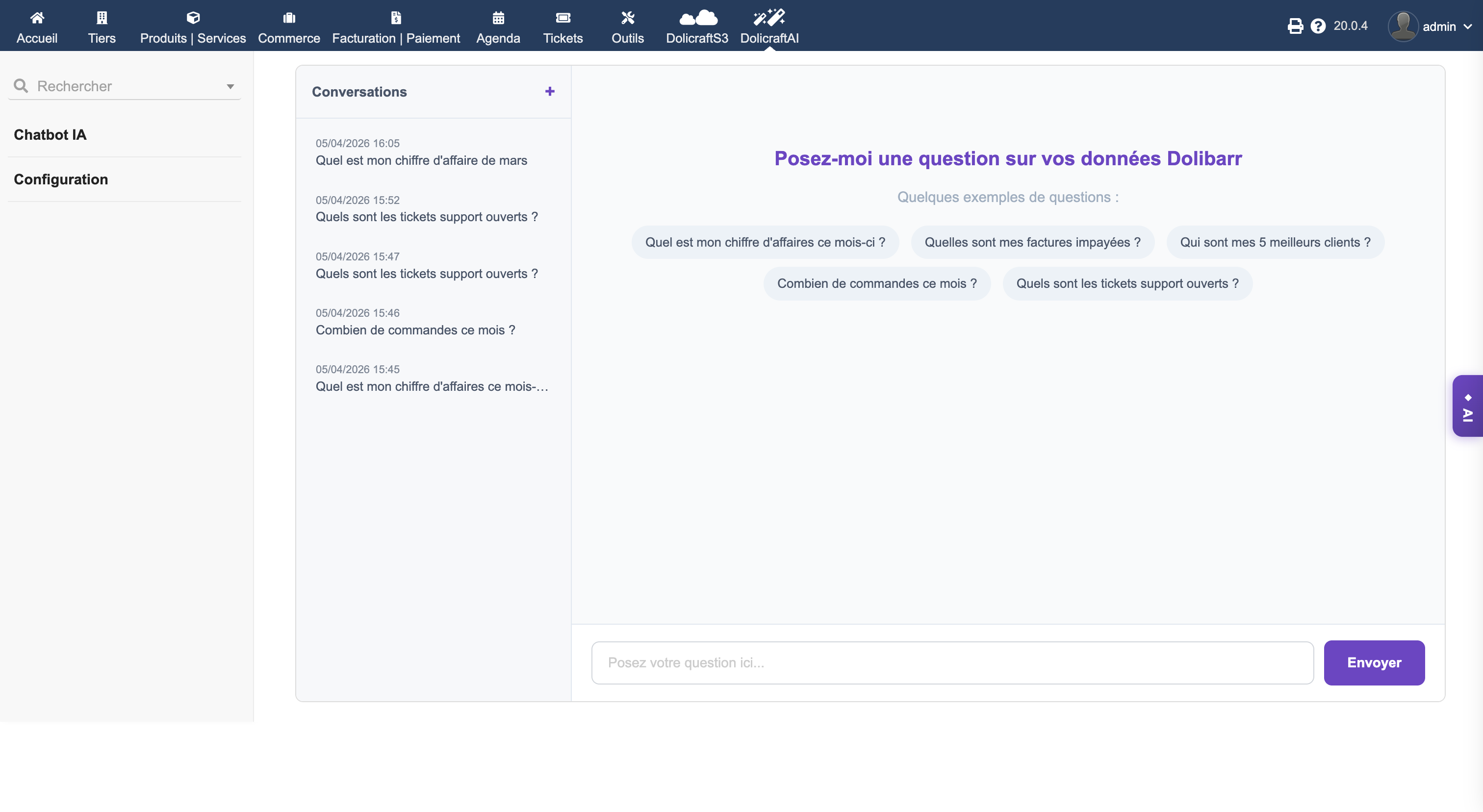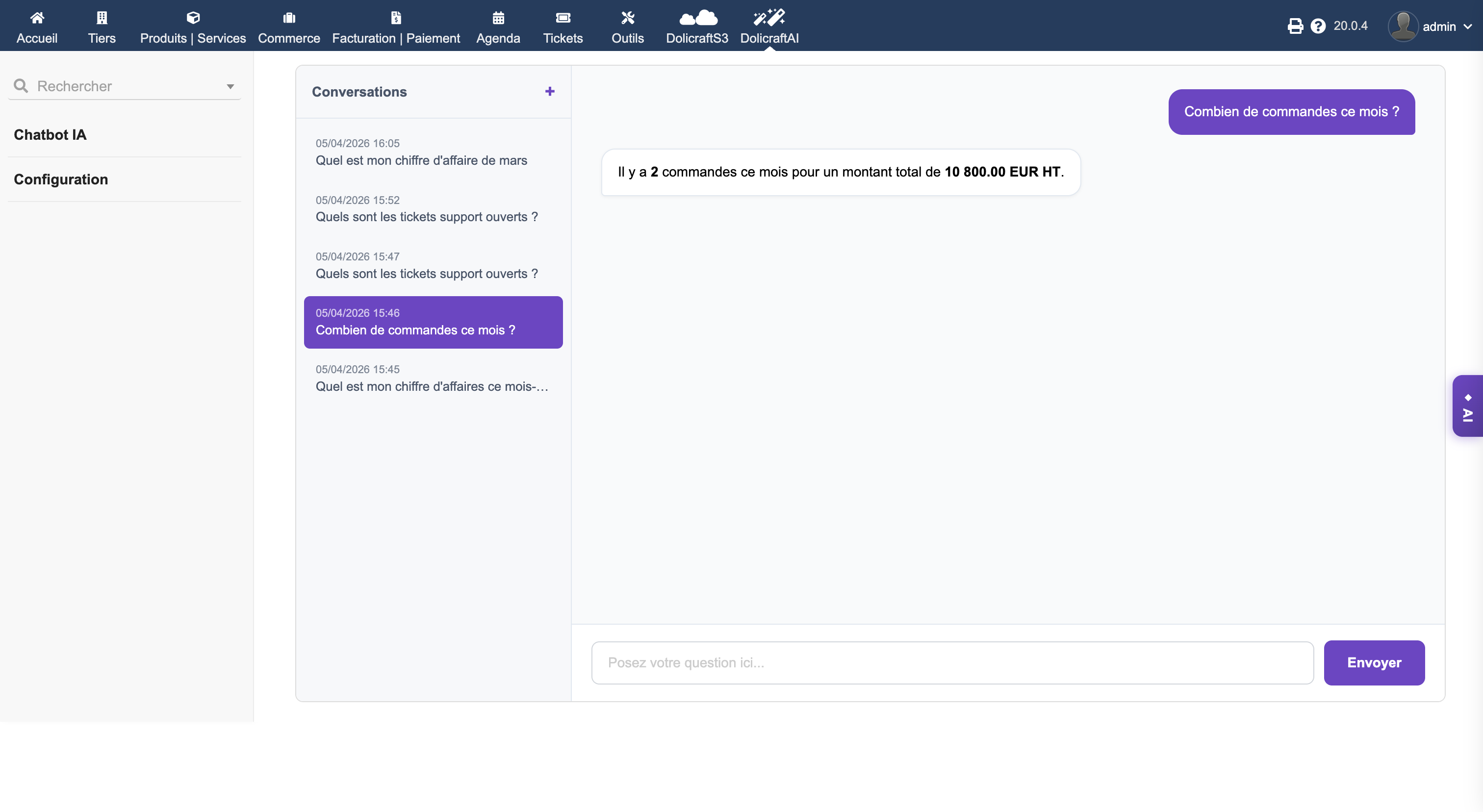 Un chat IA contextual en la barra lateral está disponible en cada página de Dolibarr. La IA detecta automáticamente lo que estás consultando (factura, presupuesto, cliente, pedido) y adapta sus respuestas. Haz preguntas, obtén sugerencias o solicita acciones - sin salir de tu página actual.