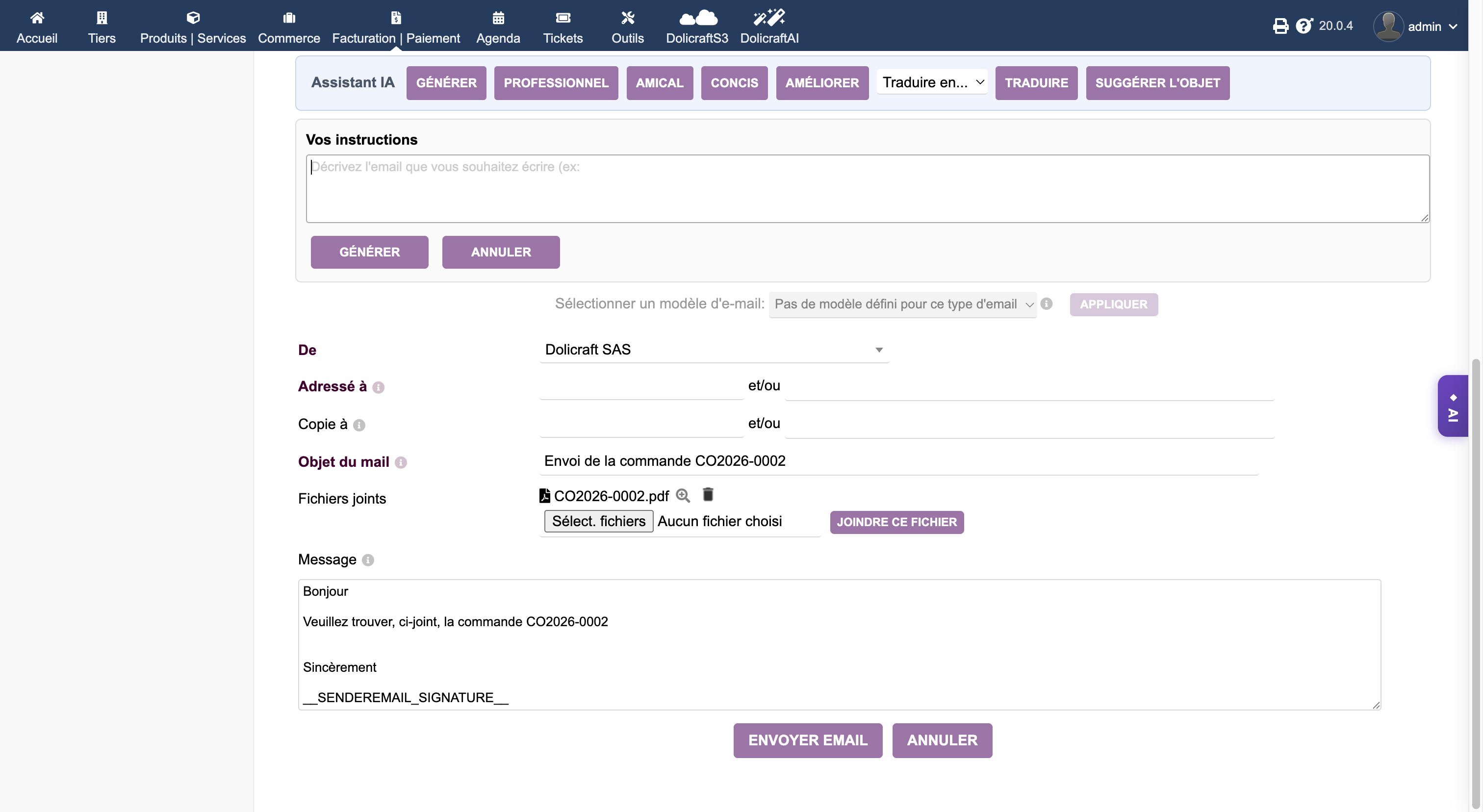 Una barra de herramientas inteligente aparece en cada formulario de email de Dolibarr (facturas, presupuestos, pedidos, tickets). Cinco acciones potentes: