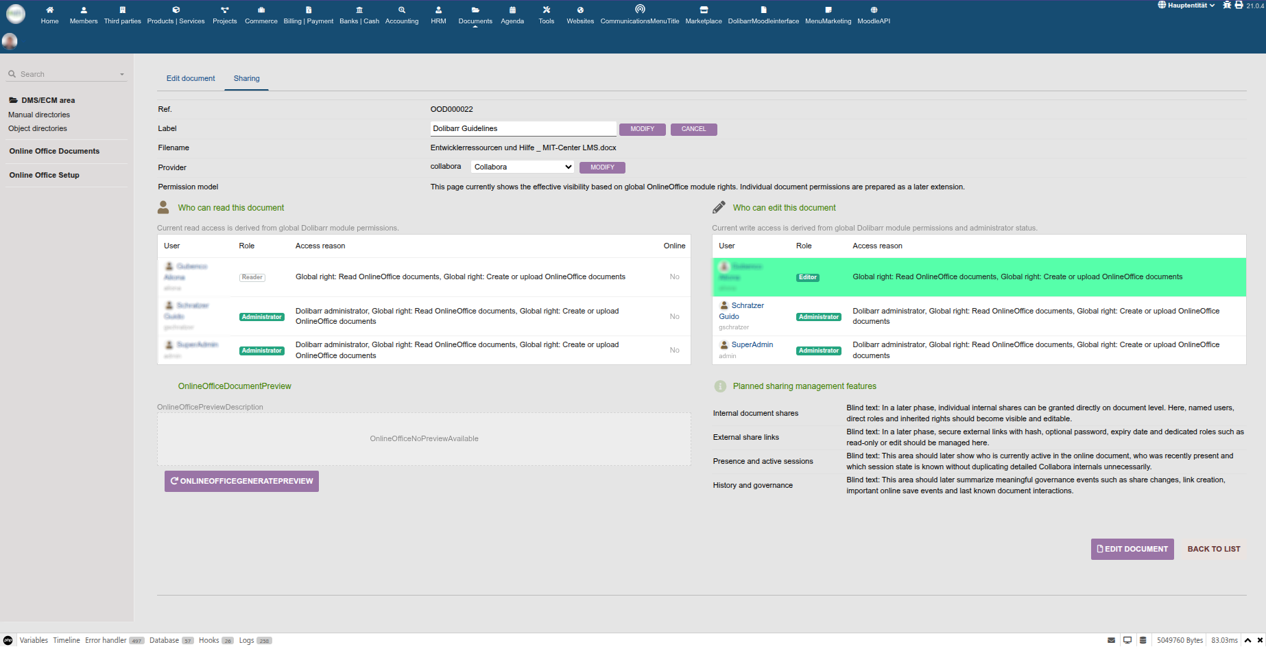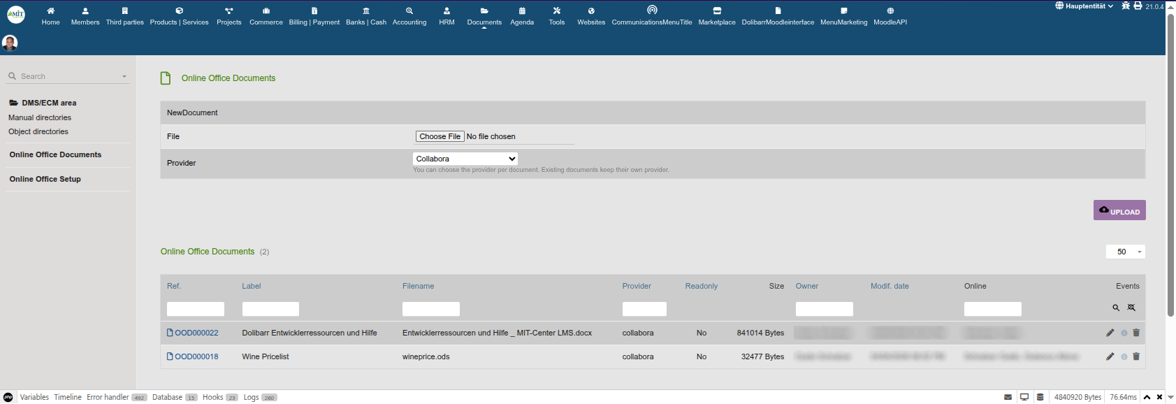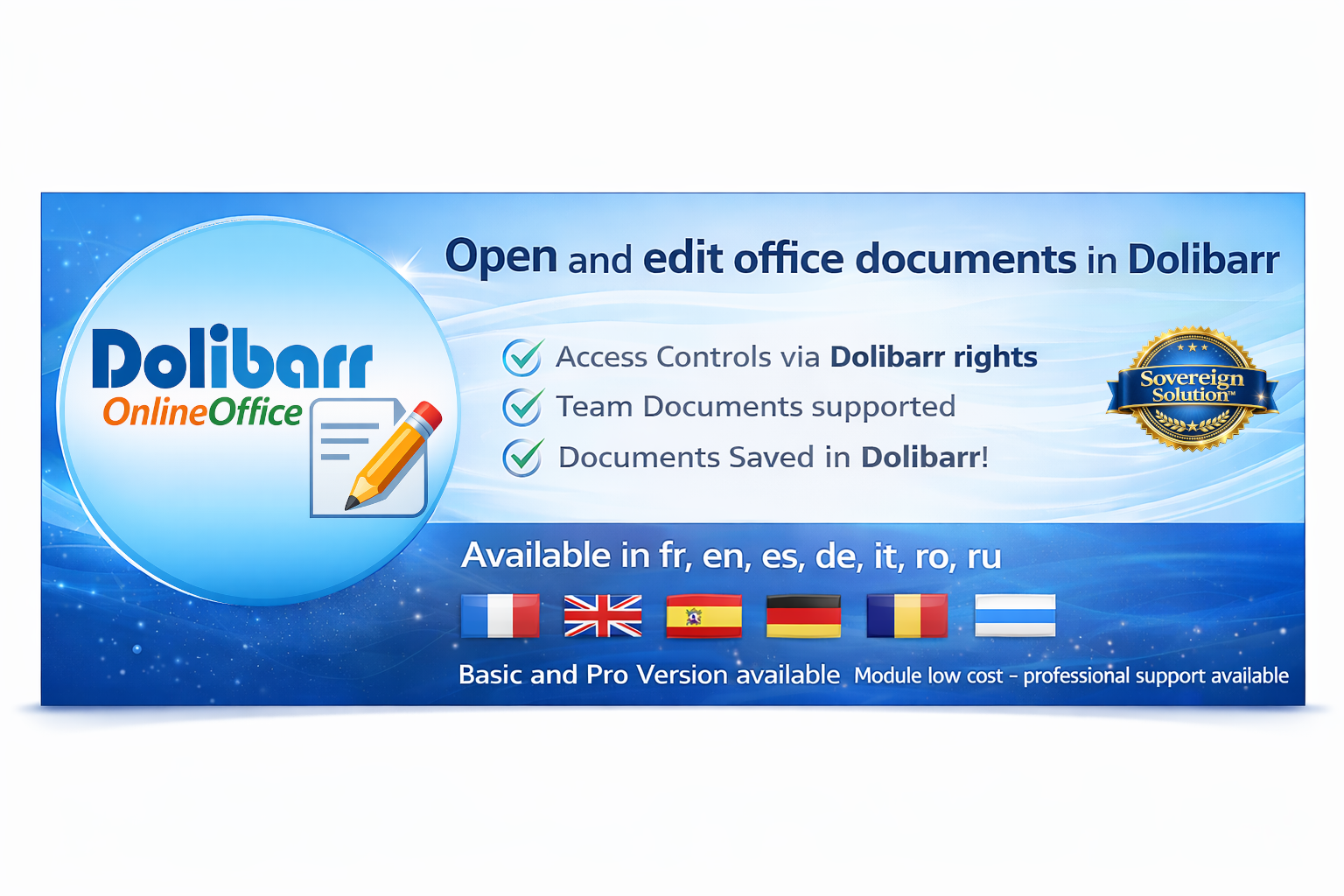 OnlineOffice connects Dolibarr with a browser-based office server such as Collabora Online and lets users open and edit documents directly from Dolibarr.