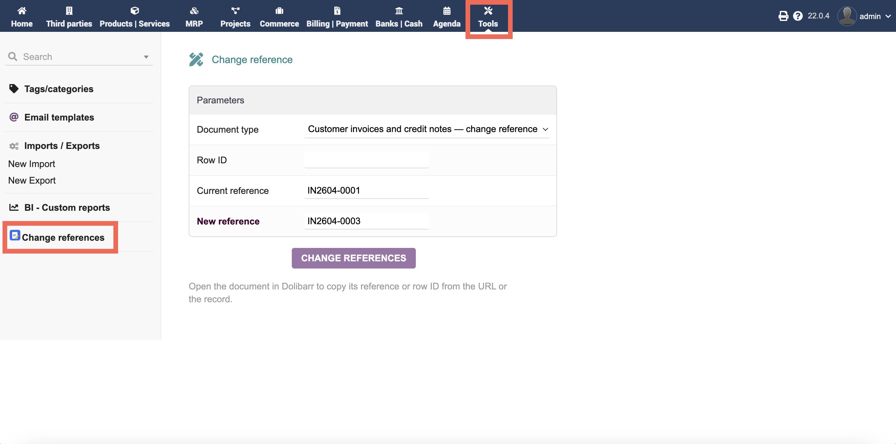 Oberflächenbezeichnung: Referenzen ändern. Ändert interne Referenzen (ref) auf kommerziellen/Lieferanten-Dokumenten und im Kalender, nach Dokumententyp.