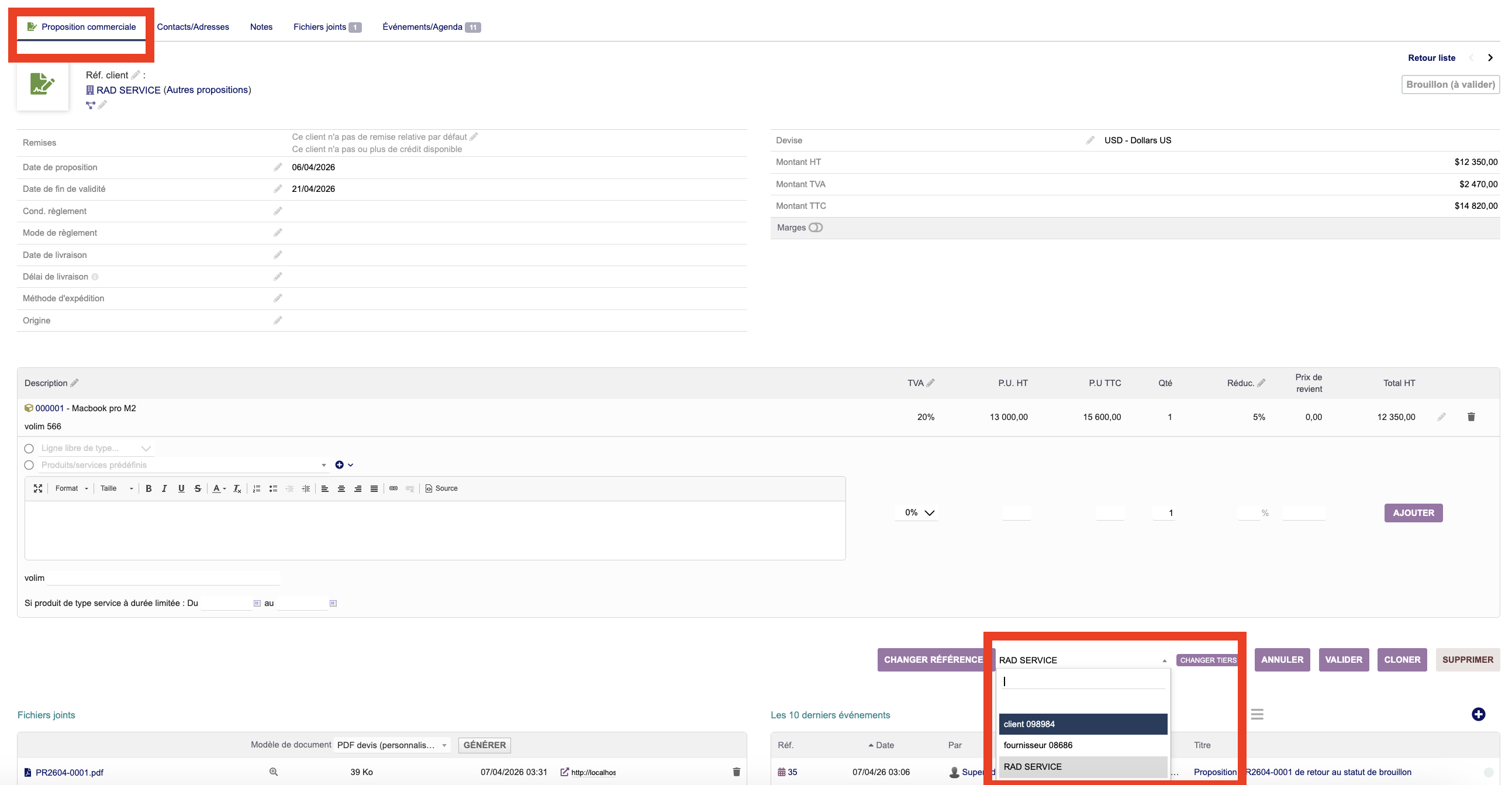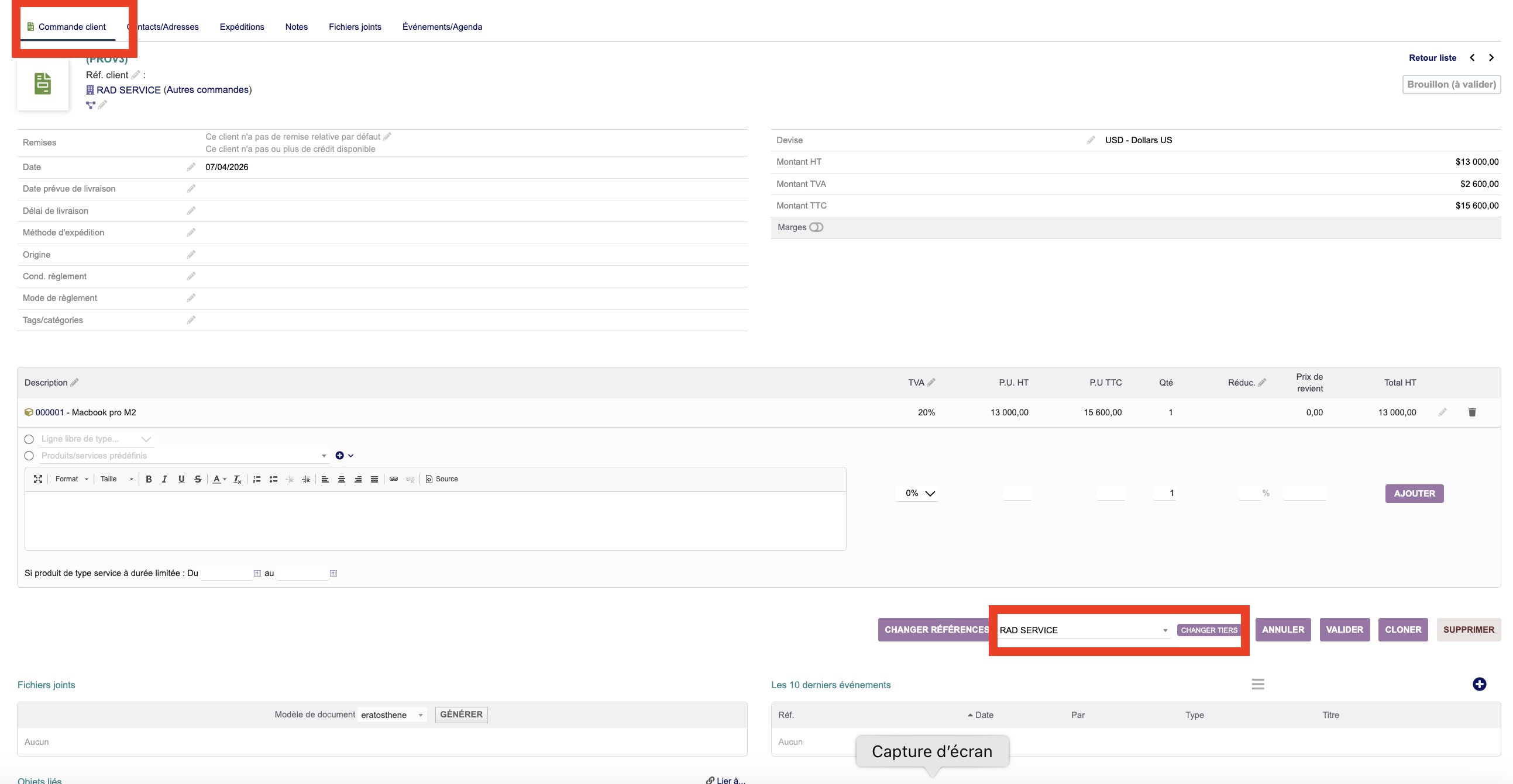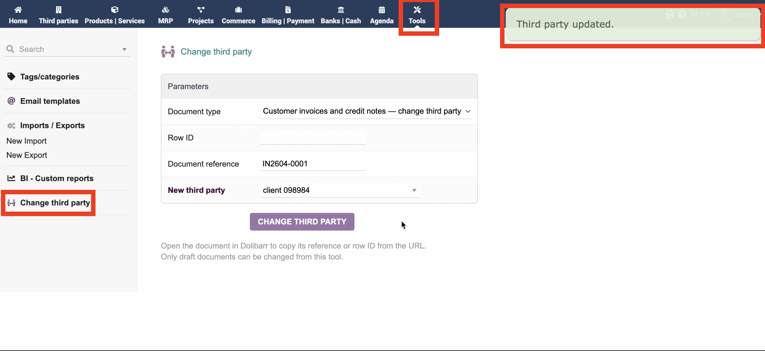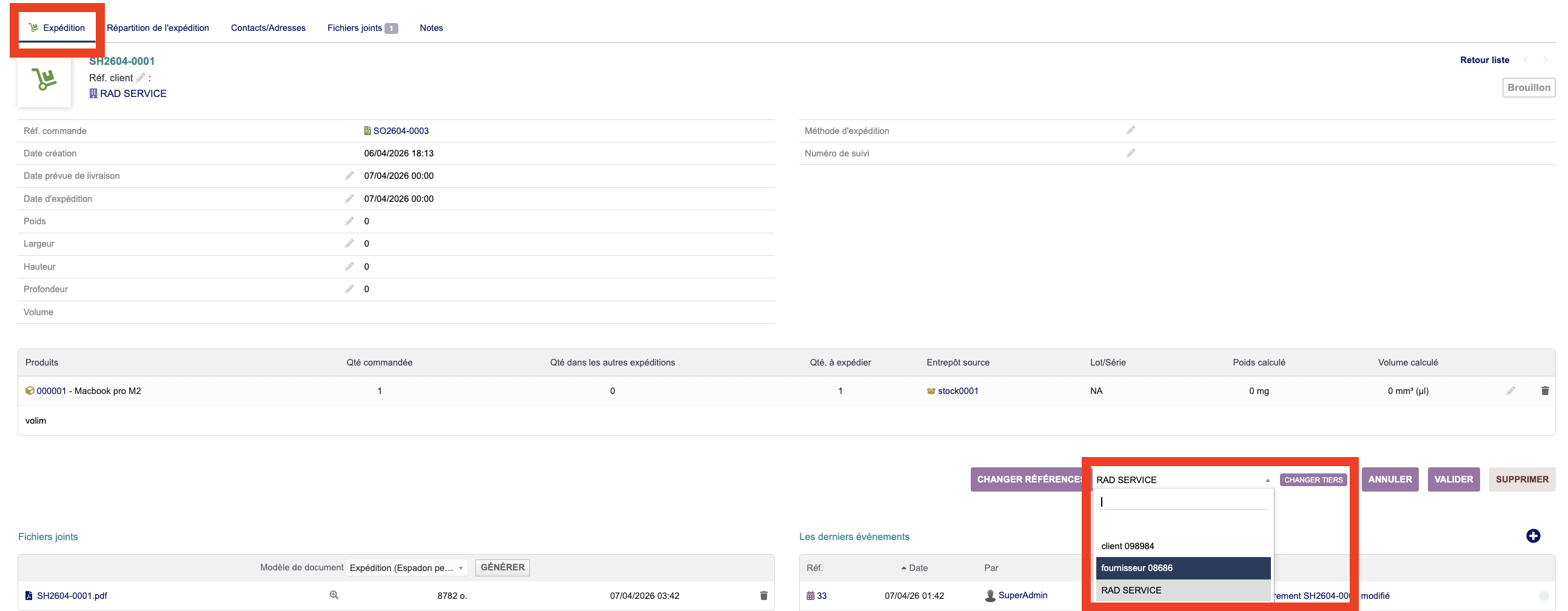 Modifie le tiers lié sur les documents vente/achat en brouillon, avec droits par type de document. Documents pris en charge : propositions commerciales, commandes clients, expéditions, réceptions, factures/avoirs clients, demandes de prix fournisseur, commandes fournisseur et factures/avoirs fournisseur.