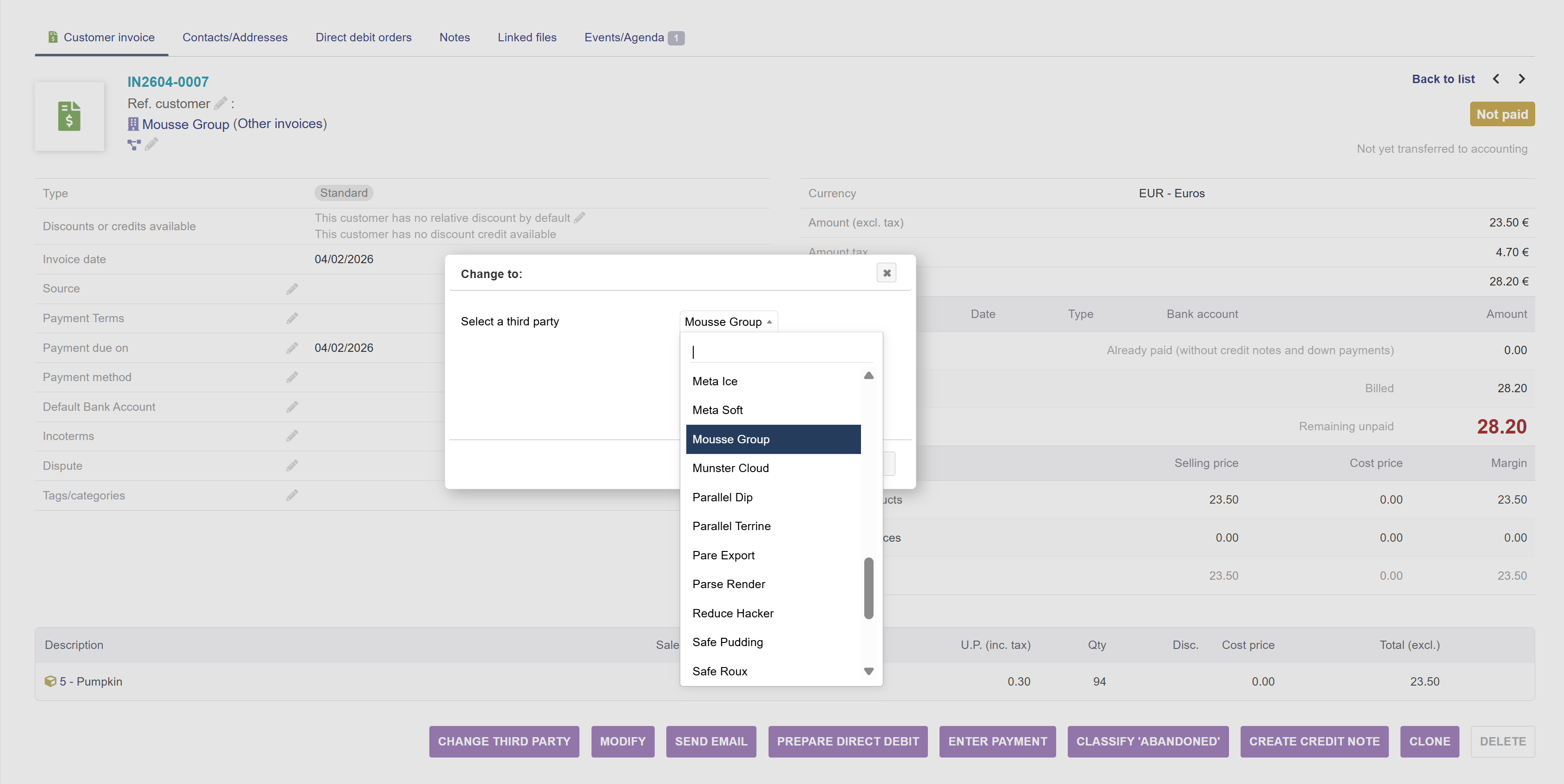This module adds a button to change thirdparty for buy/sales related documents, even if the document is validated (no need to return it to draft or reopen it again) Following documents are included.: - Commercial proposals - Customer Orders - Vendor proposals - Purchase orders - Contracts/Subscriptions - Customer invoices - Vendor invoices