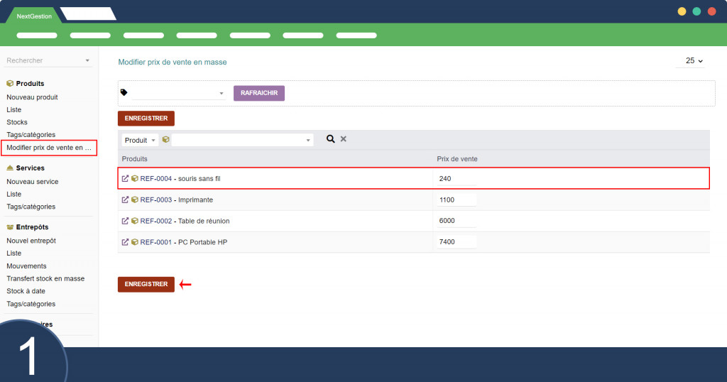 Validation et Enregistrement des Modifications : Une fois que les modifications de prix sont effectuées, les utilisateurs peuvent cliquer sur le bouton "ENREGISTRER" pour valider et sauvegarder les nouveaux prix de vente. Cette étape est cruciale pour appliquer les changements dans le système.