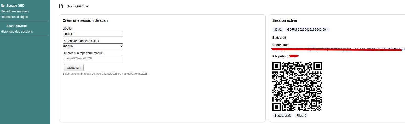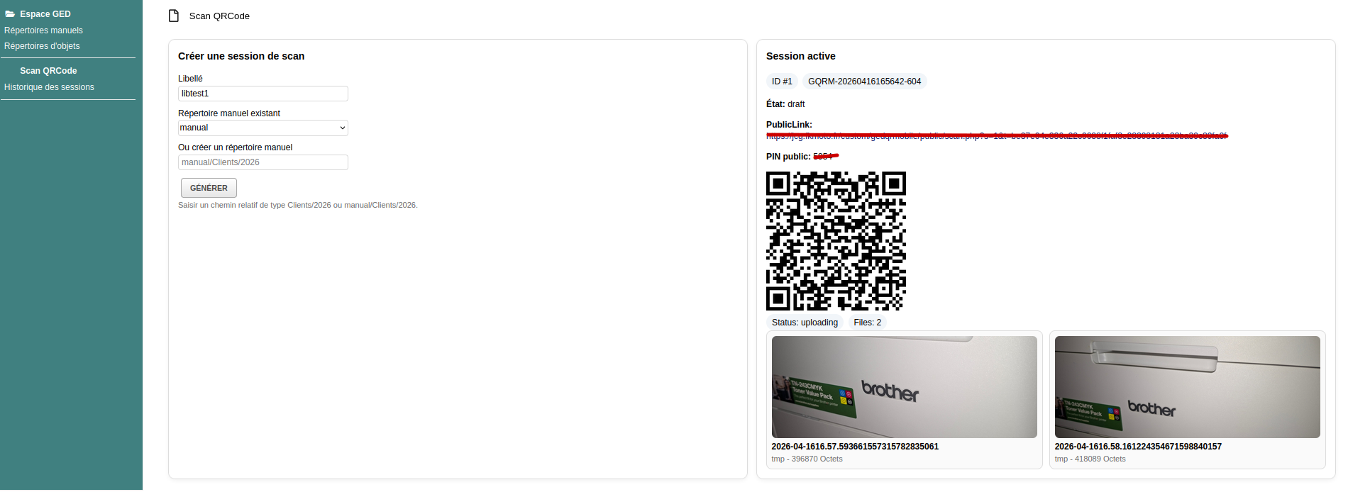 In Dolibarr wählt der Benutzer ein Verzeichnis im DMS aus oder erstellt ein neues und erzeugt anschließend einen sicheren QR-Code. Durch das Scannen dieses QR-Codes mit einem mobilen Gerät gelangt er auf eine sichere öffentliche Seite, auf der mehrere Fotos aufgenommen, jedes Bild benannt und anschließend direkt in das festgelegte ECM-Verzeichnis übertragen werden können.