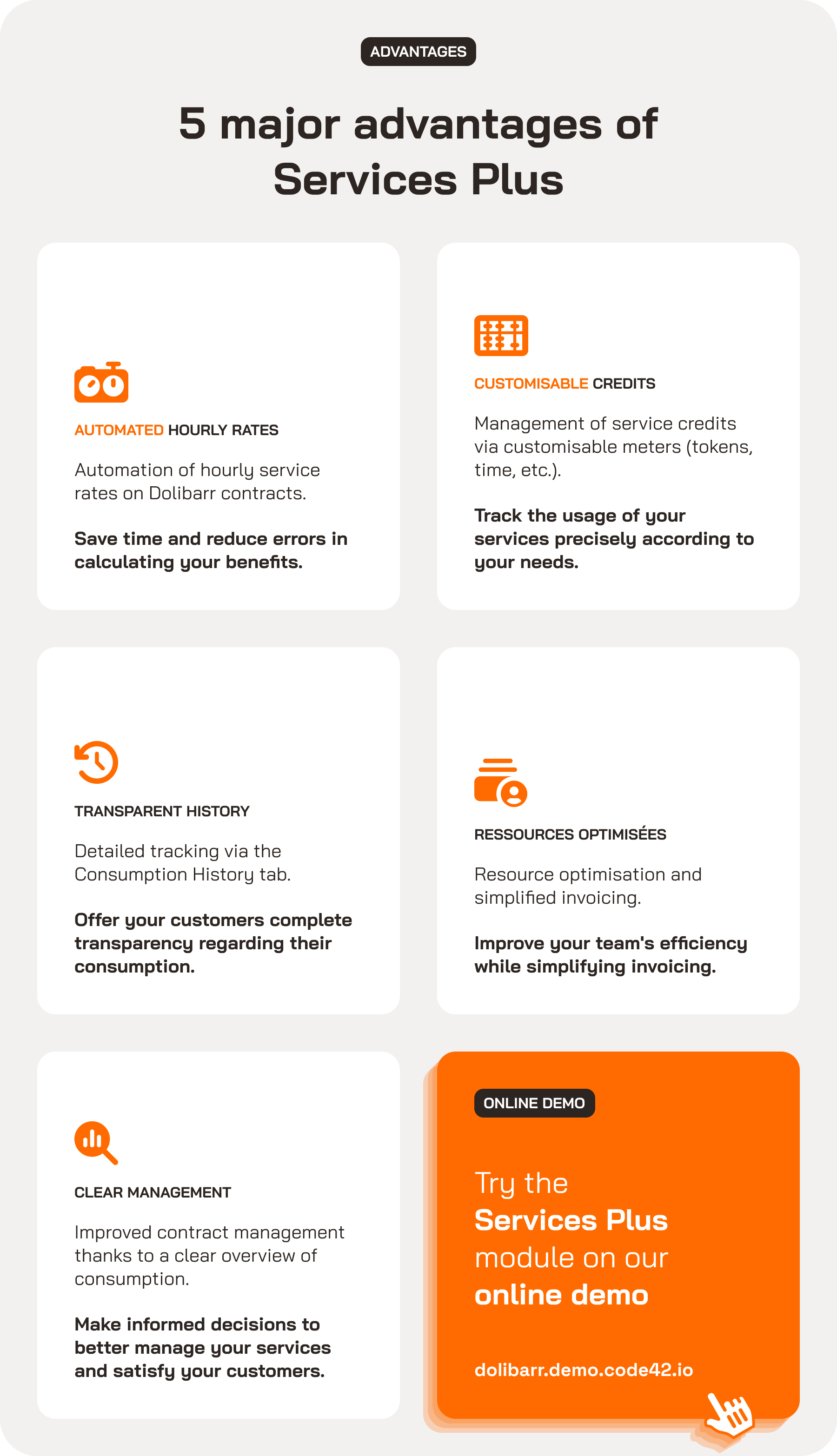 Services Plus is a Dolibarr module that automates hourly service rates and manages credits associated with contracts using customisable counters (time, tokens, etc.). It provides detailed consumption tracking via a clear history, facilitating transparency, optimising resource allocation and simplifying invoicing, while improving overall contract management.