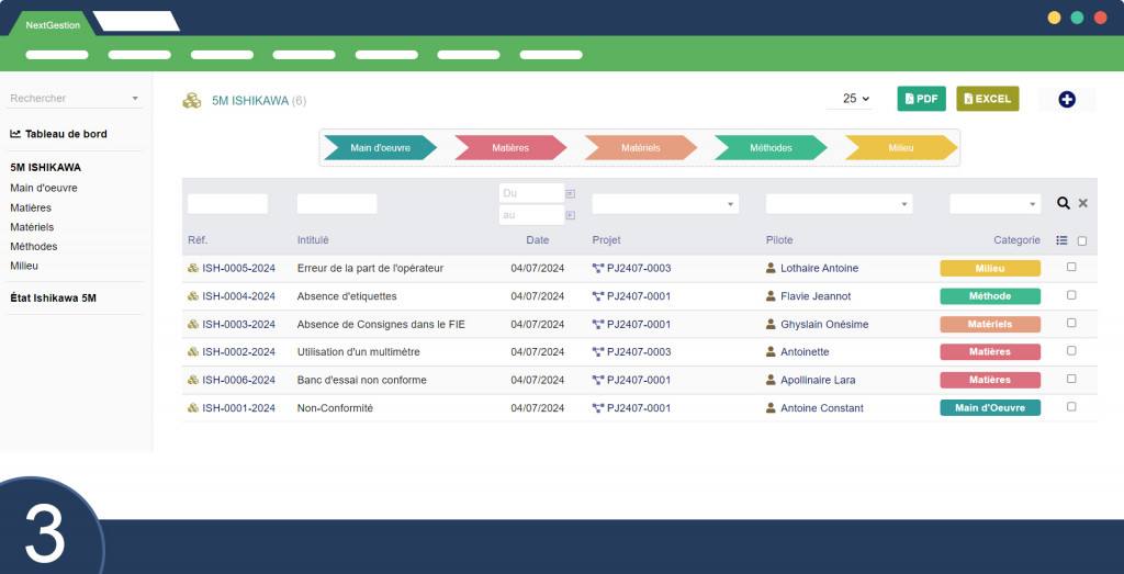 Características del módulo de diagrama de espina de pescado ISHIKAWA de 5M: Nuestro módulo le permite enumerar 10 causas principales diferentes en cada una de las 6 categorías. Estas categorías ya existentes son: Mano de obra, Métodos, Material, Máquinas, Medio Ambiente. Puede cambiar el nombre de los títulos de las categorías existentes según sus necesidades y el tipo de problema en el diagrama utilizado.