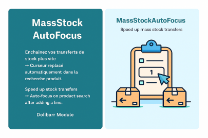 MassStockFocus is a simple and efficient Dolibarr module designed to increase productivity during mass stock transfers. It automatically refocuses the cursor on the product search field after each line is added, allowing you to enter product references one after another without extra clicks.