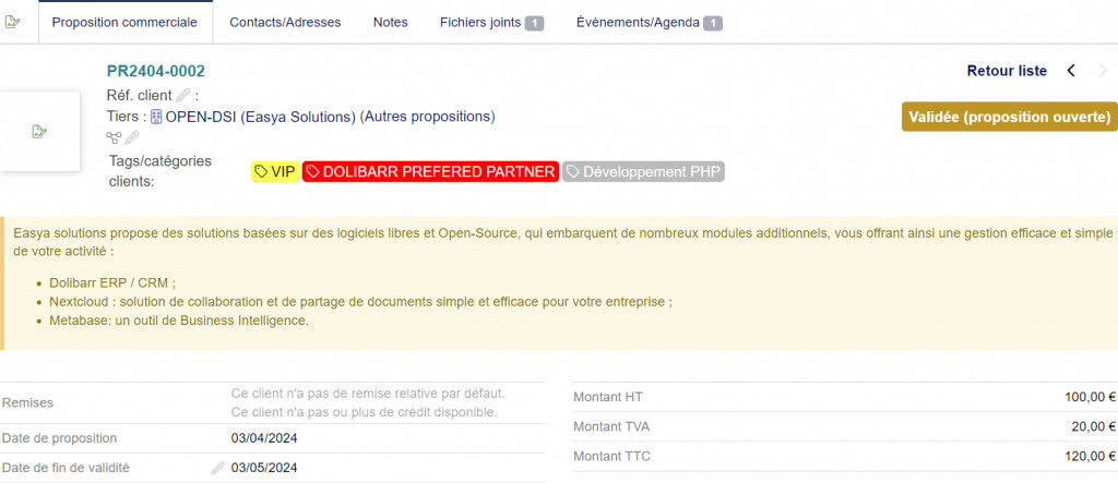 Permet d'afficher les notes privées ainsi que les tags et catégories des tiers dans le bandeau de leurs devis, commandes, factures, contrats et tickets.