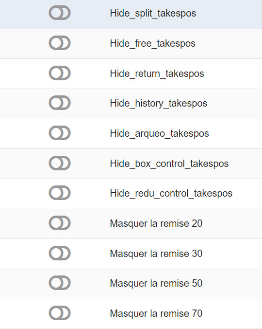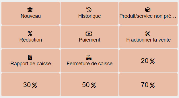 Ce module offre la possibilité de masquer des boutons dans le point de vente TakePos. Il permet également d'ajouter des boutons de réduction pour les articles nouvellement ajoutés, avec des réductions de 20%, 30%, 50%, et 70%.
