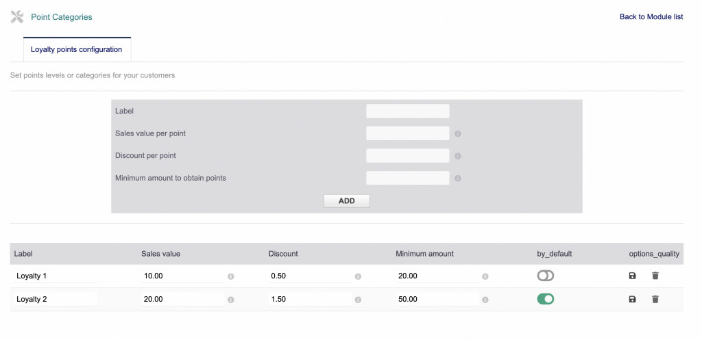 3. Category Settings: Once the module is installed, you can proceed to its configuration, the functionality allows us to have one or more categories of points for our clients, we can decide if we manage only one for everyone in general or if we manage several for different clients and thus reward with more or fewer points depending on a given classification. Below we can see how categories are configured for the loyalty points program: