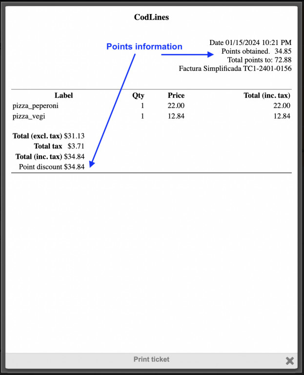 11. Printed receipts and invoice: For both standard and TakePOS invoices, a display is provided for the points obtained, used and everything related to them. For standard invoices, the "loyaltypoints" printing format must be activated, which will be found in the configuration of the module. invoices, below are screenshots with the invoice data and purchase receipt: