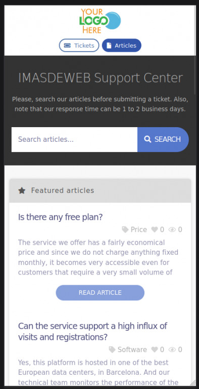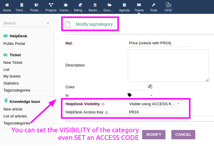 - Vollständig integriert mit Dolibarr: Die den Besuchern angezeigten Artikel und Kategorien werden vom Dolibarr-Panel aus verwaltet, vom nativen Modul "Knowledge Management". Ebenso reagieren Sie auf und verfolgen Tickets vom Panel des nativen "Tickets"-Moduls aus.
