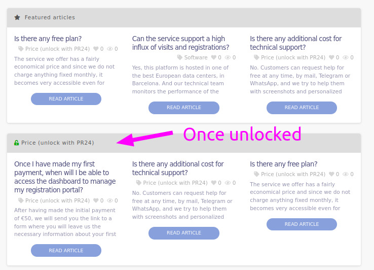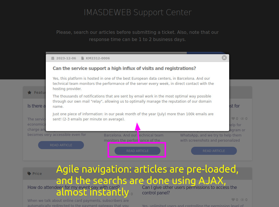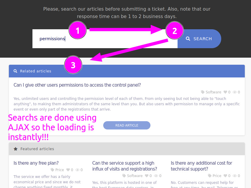 - Artikel nach Kategorien und vorab geladene Suchfunktion: Sie können die Seite so konfigurieren, dass alle häufig gestellten Fragen und Artikel geladen werden. Auf diese Weise ist der Zugriff auf Informationen nahezu sofort möglich, ohne dass auf zweite Serveranfragen gewartet werden muss.