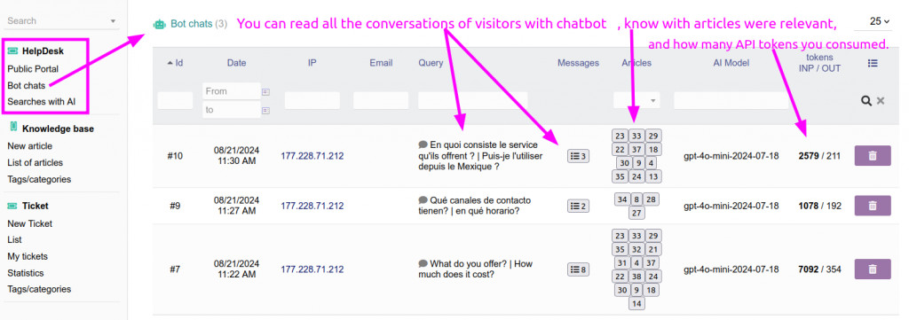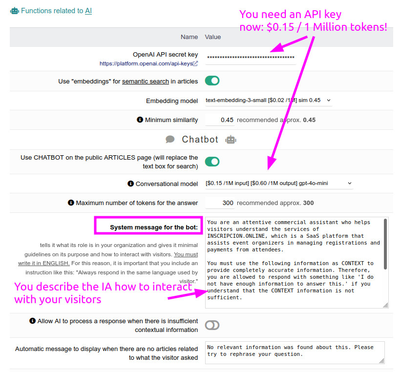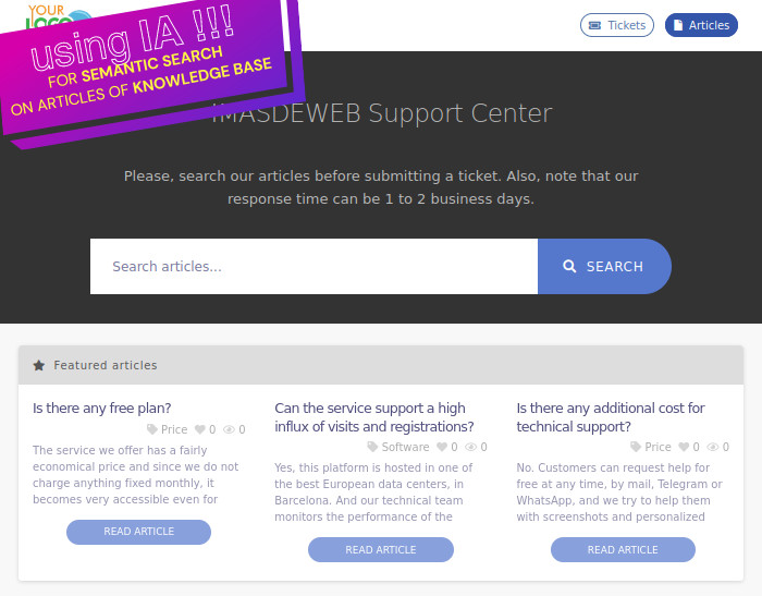 - Suche nach Artikeln/FAQs mit KI: Optional können Sie die künstliche Intelligenz hinter ChatGPT verwenden, um nach Artikeln zu suchen, die die Anfragen Ihrer Kunden am besten beantworten. Geben Sie einfach Ihren OpenAI API-Schlüssel in den Einstellungen des Moduls ein, und die Kosten für Sie sind nahezu null (weniger als 1 Euro für jede 10.000 Anfrage, die Ihre Kunden stellen!!).