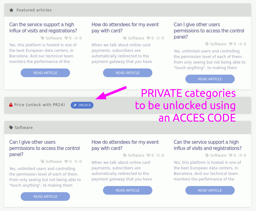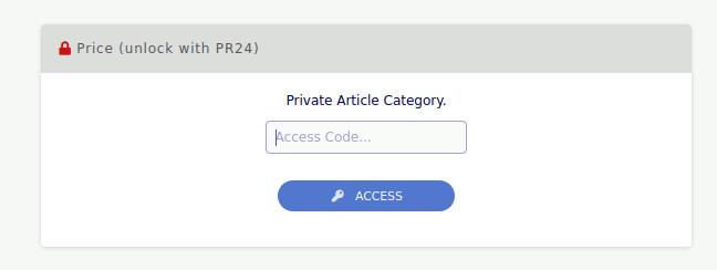 - Kontrolle der öffentlichen Sichtbarkeit von Artikeln nach Kategorie: Sie können Kategorien ausblenden (für Entwurfsartikel) und Sie können auch einen GEHEIMEN SCHLÜSSEL festlegen, damit nur bestimmte Besucher die Artikel einer bestimmten Kategorie sehen können (interne Benutzer, Lieferanten usw.).