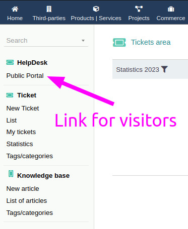- Fully integrated with Dolibarr: the articles and categories shown to visitors are managed from the Dolibarr panel, from the native "Knowledge Management" module. Similarly, you respond to and follow up on tickets from the panel of the native "Tickets" module.
