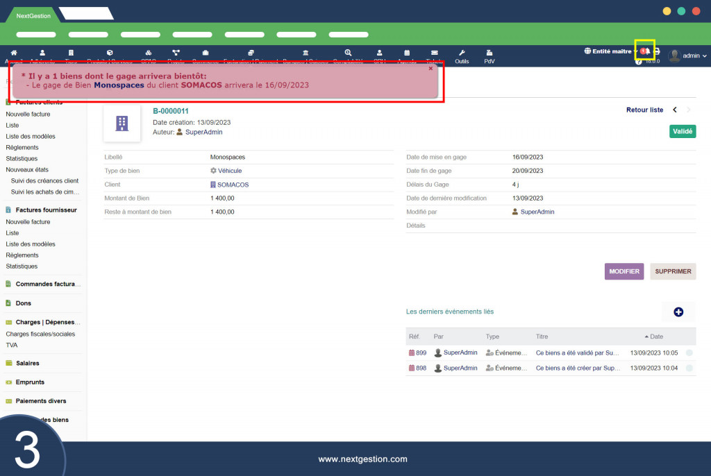 Módulo “Gestión de Propiedades” para Dolibarr El módulo “Gestión de propiedades” es una solución completa integrada en Dolibarr que facilita la gestión de activos materiales, incluidos bienes raíces, vehículos, terrenos, etc. Este módulo ofrece funciones avanzadas para registrar, rastrear y gestionar todos los detalles importantes asociados con cada activo. . Características clave: 1- Declaración de Bienes: Puede registrar la información esencial de cada bien, incluyendo el nombre, el tipo de bien (por ejemplo, inmueble, vehículo, terreno), el cliente asociado, el monto del bien, las fechas de empeño. y fin del compromiso, así como detalles adicionales. 2- Gestión de propiedades: este módulo le permite gestionar eficazmente todos sus activos. Se puede visualizar la referencia del activo, su descripción, el cliente al que está asociado, los representantes comerciales de terceros vinculados al mismo, el tipo de activo, la prenda y las fechas de finalización de la prenda, el importe del activo, el cantidad restante adeudada. y el estado actual de la propiedad. 3- Tipos de activos predefinidos: El módulo ofrece tipos de activos predefinidos, como "Vehículo", "Terreno" y "Bienes raíces", para simplificar la clasificación de sus activos. 4- Informes e informes: el módulo ofrece dos informes esenciales: "Estado de cuentas por cobrar del cliente por bienes" para realizar un seguimiento de los montos adeudados por el cliente en relación con los bienes, y "Estado de bienes pignorados" para ver los bienes actualmente pignorados. El módulo "Property Management" de Dolibarr facilita la gestión de activos materiales ofreciendo una solución centralizada y eficiente para registrar, rastrear y gestionar todos los aspectos relacionados con sus activos. Esta solución mejora la transparencia y eficiencia de la gestión de propiedades dentro de su negocio, permitiéndole tomar decisiones informadas y garantizar una gestión óptima de sus activos. Módulo “Gestión de Propiedades” para Dolibarrdemo/demo If you order our module you benefit from: