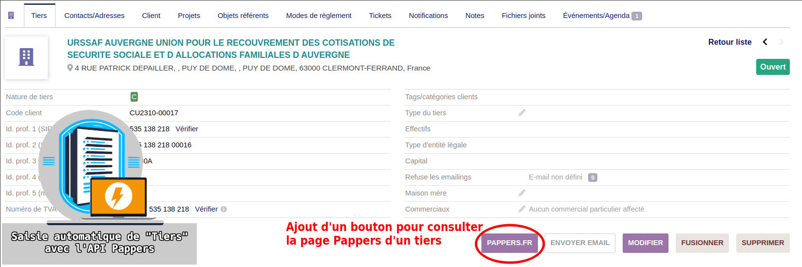Remplissez instantanément le formulaire de création/édition de Tiers à partir des données fournies par Pappers. Cherchez une entreprise par nom ou par SIREN/SIRET et laissez le module remplir la plupart des détails pour vous.