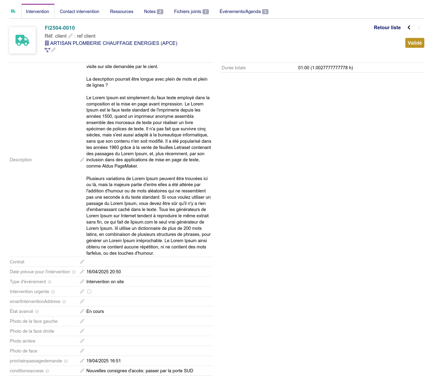 With Smartinterventions your technicians equipped with a smartphone can take 5 photos of their intervention and dictate the report directly on site. More paper sheet, more time lost, everything is directly associated with the intervention that you will have opened beforehand in Dolibarr.