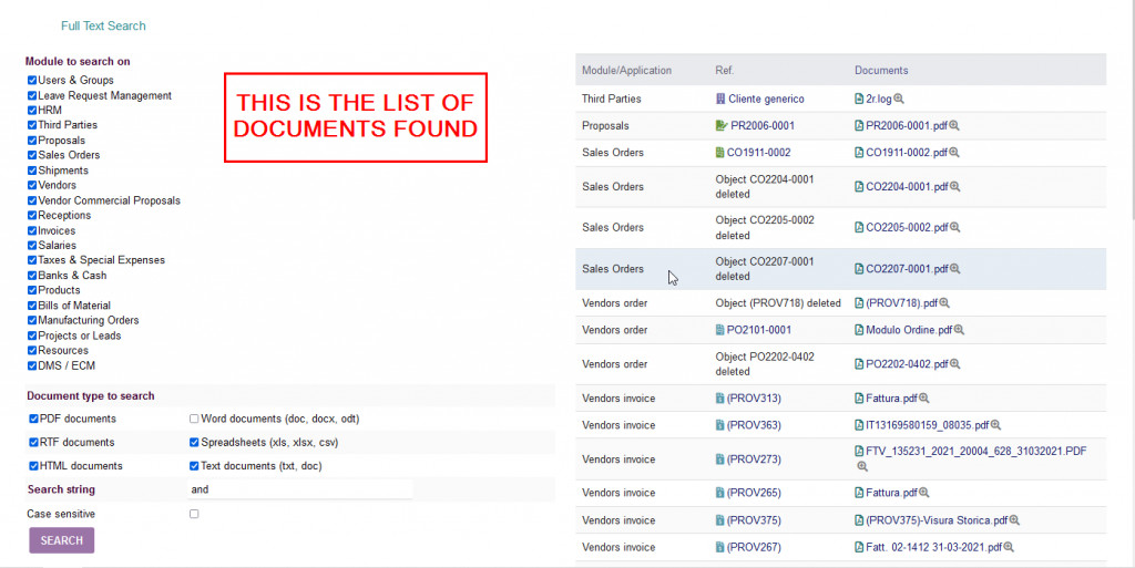 Questo modulo permette, in maniera molto semplice, di cercare nell'ambito di tutti i documenti di Dolibarr, quelli che contengono una determinata parola.
