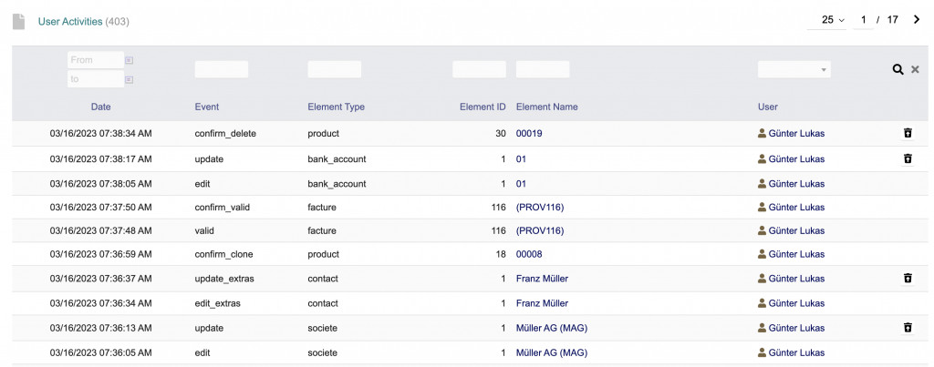 Example: When a user activates the edit mode of an element (e.g. by pressing the "Edit" button on a contact), the event "edit" is recorded. At this point, however, no data has been changed. Only when the user presses the "Save" button, the entered data will be transferred to the database. In this case the event "update" is recorded. Which changes have been made can be seen in the list of user activities by moving the cursor over the recycle bin icon on the right side of the screen. Clicking on the recycle bin icon will then undo the changes. Deleted items can be restored in the same way.