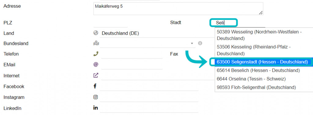 Entering correct addresses made quick and easy: Based on the entry of post code (zip) or city name, the rest (post code, city name, federal state/canton and country) get proposed and auto-filled. Works in all address forms within Dolibarr. This module covers all post codes, cities and cantons of Germany, Austria, Switzerland and Liechtenstein.