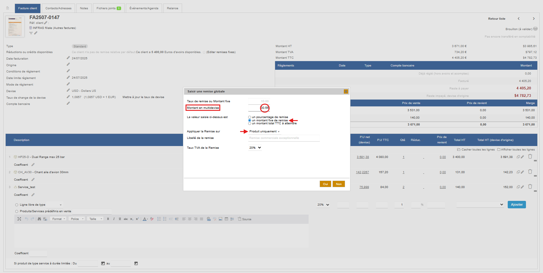The use of InfraS discounts simplifies your commercial management: - Discounts in percentage or value (monetary) - Cascading discounts (cumulative: 10% + 5%) - Discounts on products only - Dynamic calculation (any modification leads to a recalculation of discounts) - Respected margins - Discounts on products or services