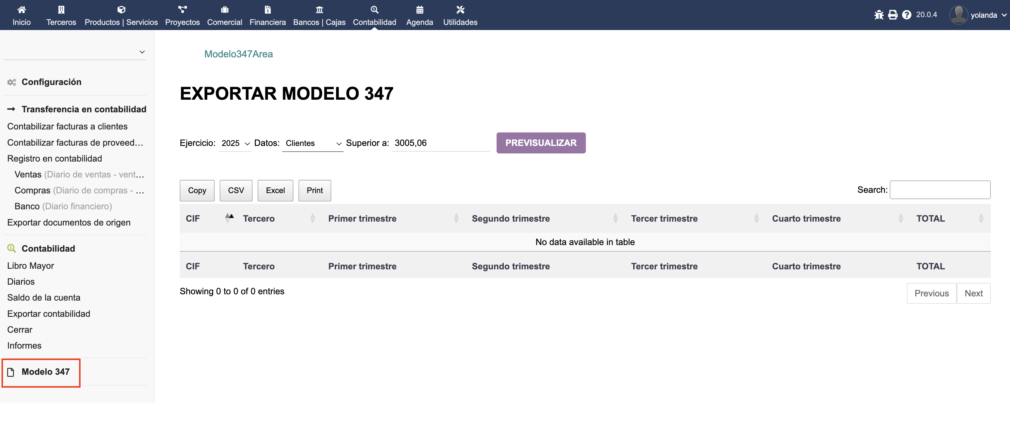 Añade en el menú contabilidad un nuevo Item 'Modelo 347' desde el cual previsualizar y exportar en excel los datos necesarios para rellenar el modelo 347. Pudiendo seleccionar si exportar datos de clientes o proveedores y posibilidad de indicar un importe personalizado.