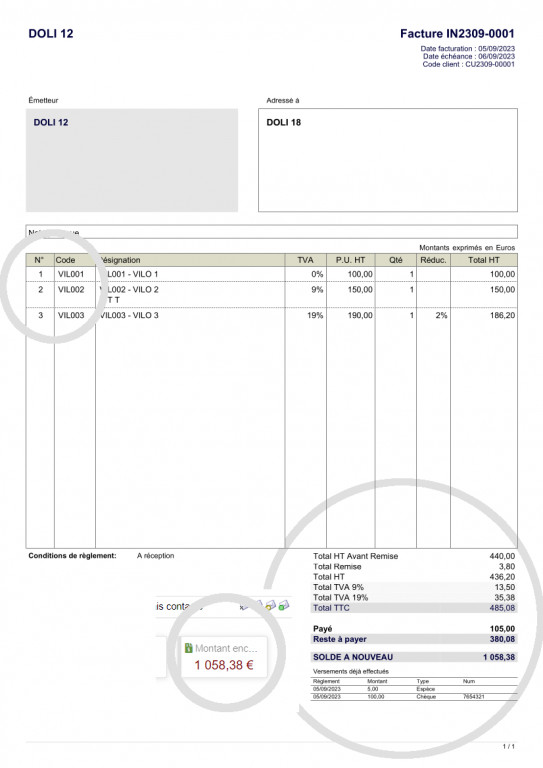 Invoice PDF template with column number order, product code and current outstanding bills