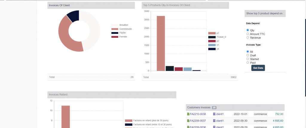 Module allows you to have statistics of all your clients, invoices, proposals, orders, categories and warehouse (stock) on forms of diagrams and tables. What has this module : - Diagrams of top 5 clients in invoices, proposals and orders depend on Amount TTC - Diagrams of top products by Amount TTC, Qty, Revenue in Type of invoices, proposals and orders...
