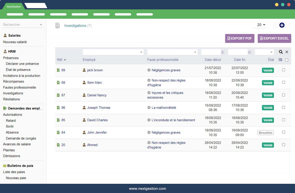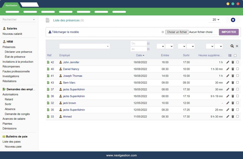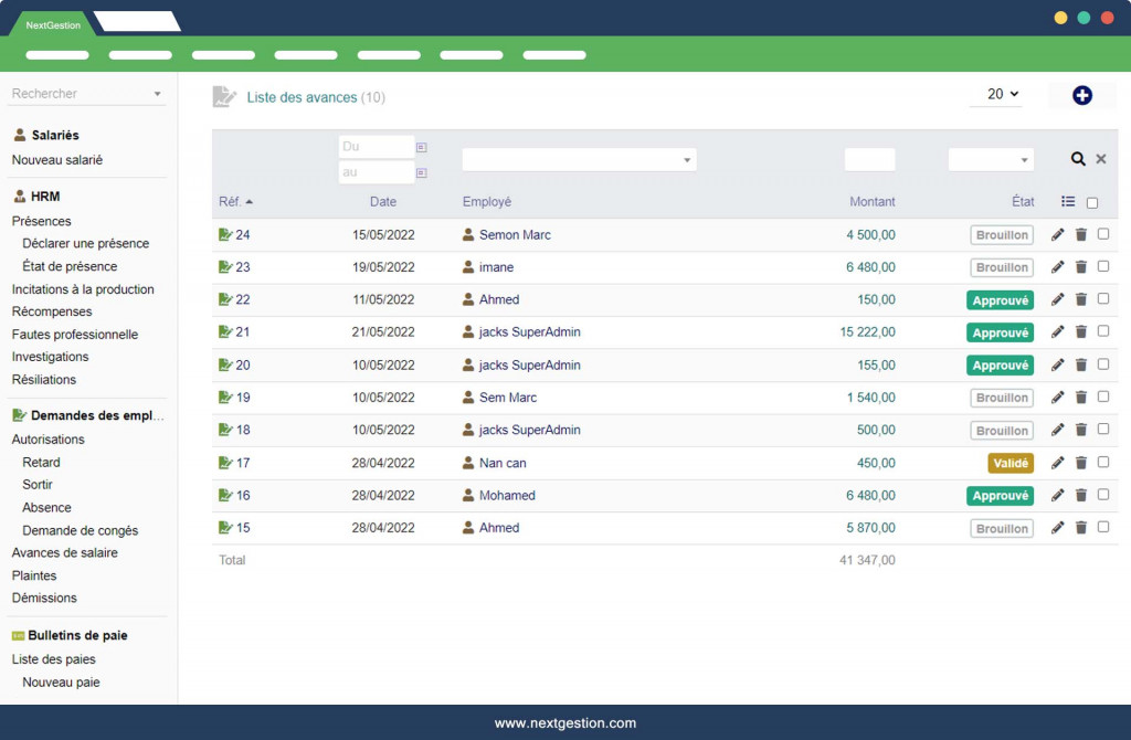 - Manage the presence and absences of your employees; - Manage production incentives; - Follow the rewards of your employees; - Manage the misconduct of your employees; - Follow the investigations and terminations of your human resources via our HRM-PRO system; - Manage leave requests, delays, absences and exits for each person within your company; - Manage requests for salary advances for each employee; - Track complaints and resignations of your human resources through our system; - Edit and generate the payslips of your employees (after having introduced the salary rules of your country); - Generate your company's payroll situation, based on all your employees' pay slips; - In addition to all this, our advanced HRM-PRO solution for the human resources management system contains the following options: Module settings, advanced filters on all the features present on the module, Excel and pdf exports to generate reports or situations ready for printing. The new V4 version of Module includes the following updates: