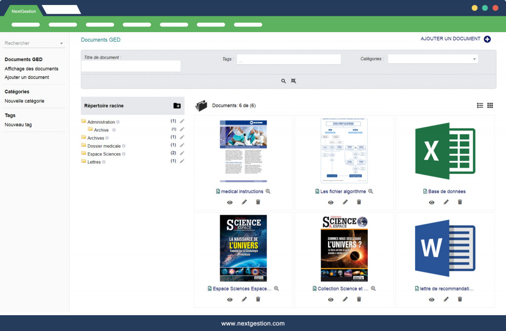 2- Classer les documents dans des repertoires avec les droits d'acces en fonction des utilisateurs (creation, lecture, modification, suppression..) 3- Effectuer la recherche dans les documents en mode texte type de documents indexés : pdf, word, excel, ppt, txt, rtf 4- Possibilité d’uploader les documents joints, les supprimer, etc 5- Possibilité de rajouter autant de tag que souhaité 6- Possibilité de classer le document dans 1 ou plusieurs catégories 7- Possibilité de classer le document dans 1 ou plusieurs sous catégories 8- Possibilité de définir les champs descriptifs des documents 9- Possibilité de l'envoi d'un document par email au tiers (Fournisseur ou client). La nouvelle version V4 de Module comporte les mises à jour suivantes: