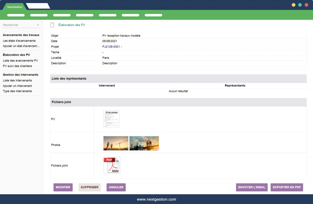 Il modulo "Monitoraggio cantiere" V4 consente di: - Inserisci i rapporti di avanzamento del tuo sito - Allega i documenti e le foto reali dei tuoi siti nelle relazioni sullo stato di avanzamento - Immettere i vari stakeholder sul sito di costruzione - Modificare i report di avanzamento e PV come file PDF - L'e-mail dei rapporti sullo stato di avanzamento e PV