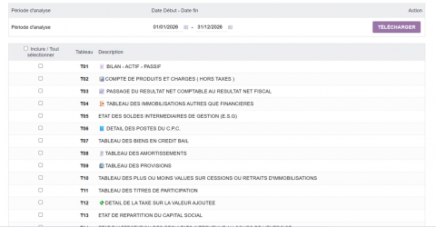 Generate the Moroccan “Liasse Fiscale” from Dolibarr: T01 Balance Sheet (Assets/Liabilities), CPC (T02), tax result reconciliation (T03), fixed assets, depreciation, provisions, VAT, stocks, financing table, and all required annex tables up to T26.