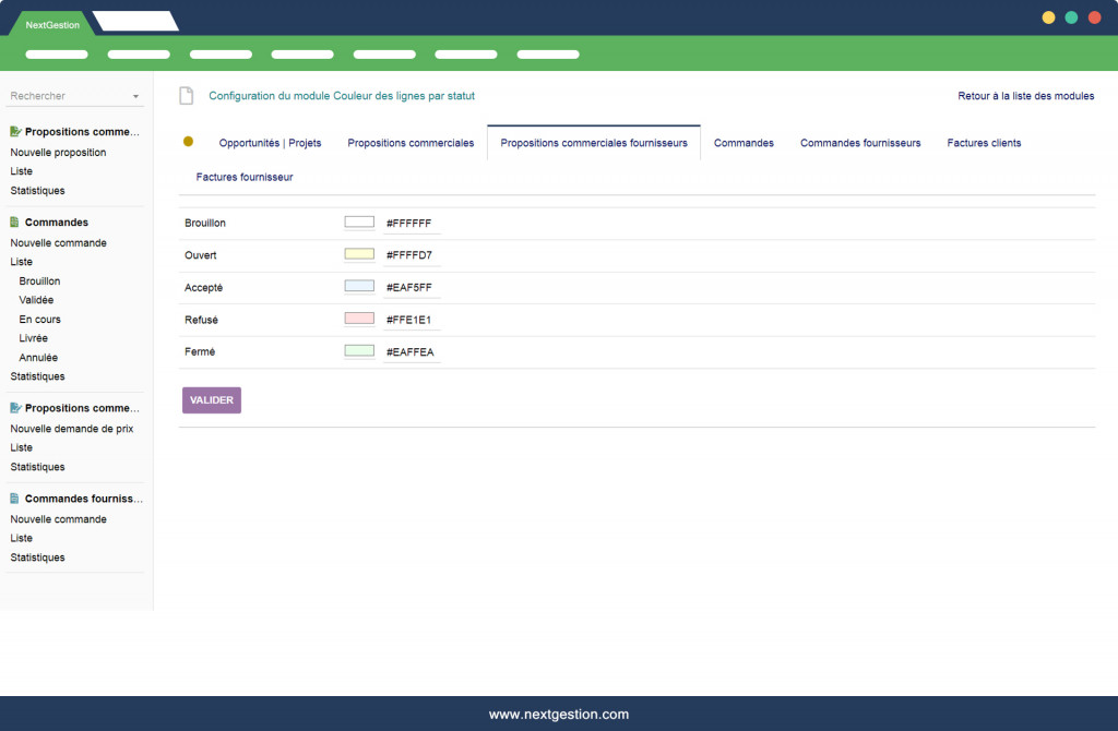 Le module "Couleurs des lignes par statut / état Facture, commandes ... V4" vous permets de faire le suivi de chaque état ou statut de vos: factures clients, Factures fournisseurs, Propositions commerciales, Commandes clients, Commandes fournisseurs d'une façon très lisible est simple.