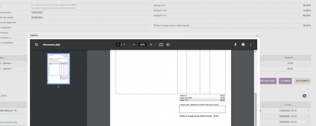 Prozentsatz des Gesamtbetrags in Kundendokumenten anzeigen: Fügt Kundendokumenten (Angeboten, Rechnungen) automatisch eine Zeile hinzu, die einen als Prozentsatz des Gesamtbetrags einschließlich Steuern berechneten Betrag mit personalisierter Positionierung im PDF angibt.