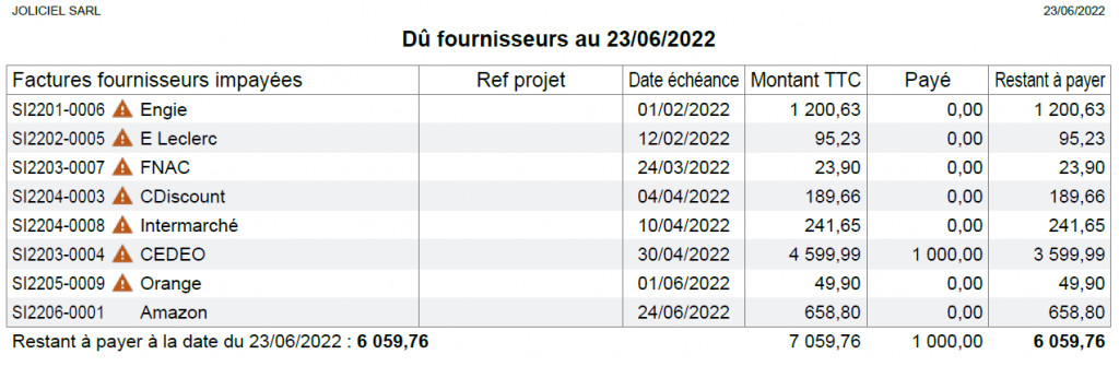 Suivre les détails de paiement des fournisseurs Permet de générer un tableau PDF, des factures restant dues envers les fournisseurs (ou un fournisseur précis), à une date donnée. Permet d’afficher le montant restant dû envers les fournisseurs sur l’écran d’accueil de Dolibarr. Support technique : dolibarr@joliciel.fr