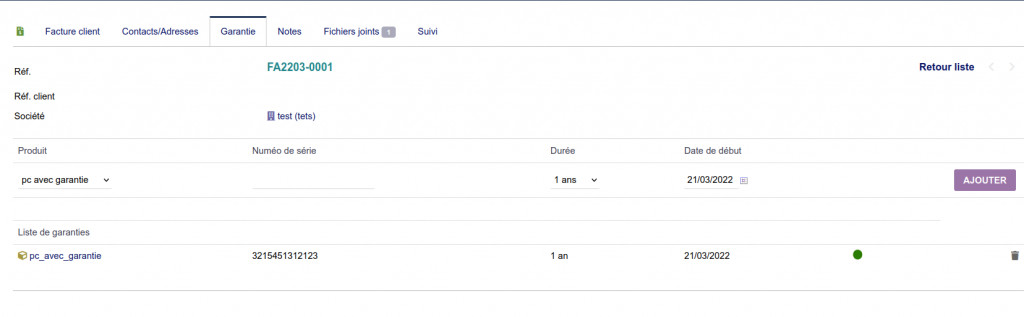 Ce module fournit un onglet sur les facture afin d'associer une garantie à une vente client. Il permet donc le suivi des garanties lors des vente client.