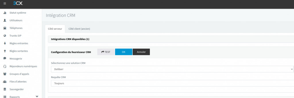 ipbx3cx module link with a 3CX.Configuring 3CX will ensure the following: Search and completion of the 3CX contact book with dolibarr elements Creation of contact / Third parties Log of incoming and outgoing calls in the calendar. The module provides the file needed by 3CX; Note that it is necessary to have a 3CX enterprise license