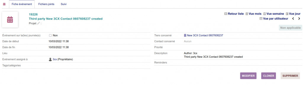 | Description | ipbx3cx module link with a 3CXAddition of specific entry point on the dolibarr API to allow the link with 3CX.Configuring 3CX will ensure the following: Search and completion of the 3CX contact book with dolibarr elements Creation of contact / Third parties Log of incoming and outgoing calls in the calendarthe module provides the file needed by 3CX; Note that it is necessary to have a 3CX enterprise license |
