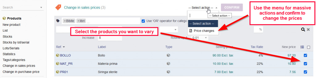 Une fois que l'article spécifique qui apparaîtra dans le menu "Produits" a été sélectionné, la modification massive des prix est possible en suivant les étapes simples suivantes :