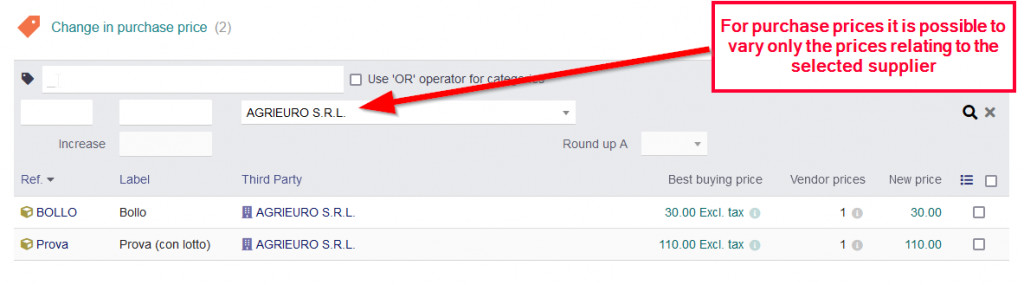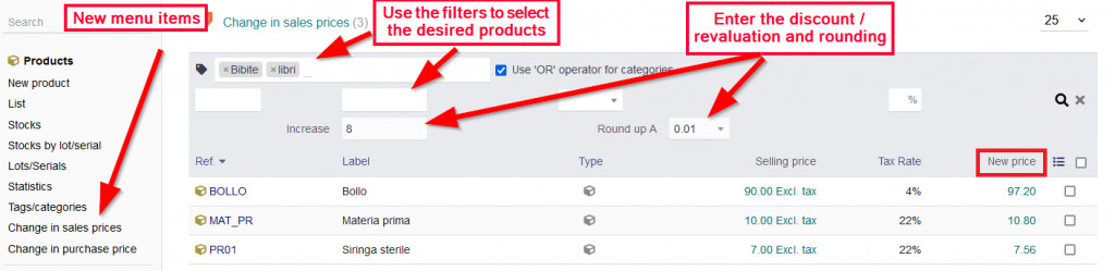 • sélection des articles dont vous souhaitez modifier le prix selon les méthodes standards de Dolibarr
