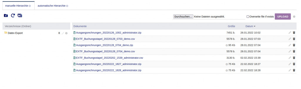 With this module, invoice data can be exported as XML files. The XML files are saved in a ZIP file and can then be imported into Datev using Datev Receipt Transfer.