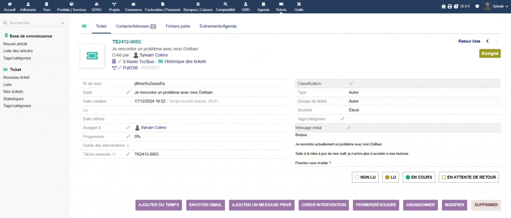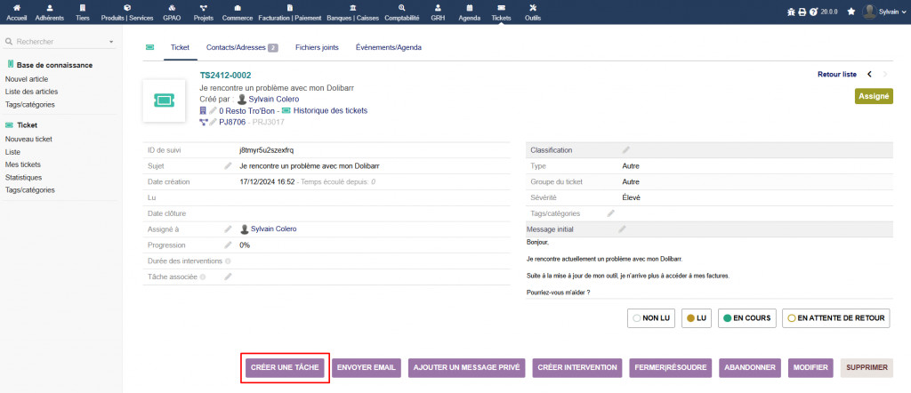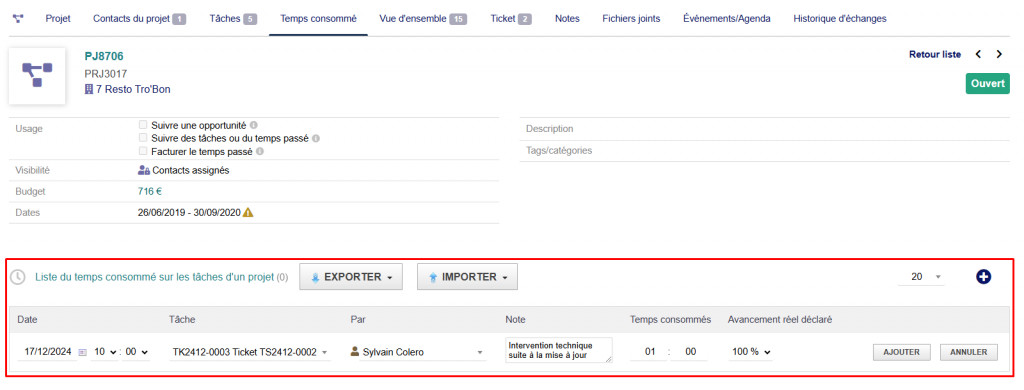 This module allows you to transform a ticket into an Associated task. This will allow you to add the time spent, regarding the resolution of the ticket in the Time consumed tab of the project linked to it. The module is used to save time concerning the addition of time consumed on a project, the time consumed can be immediately added via a Ticket.