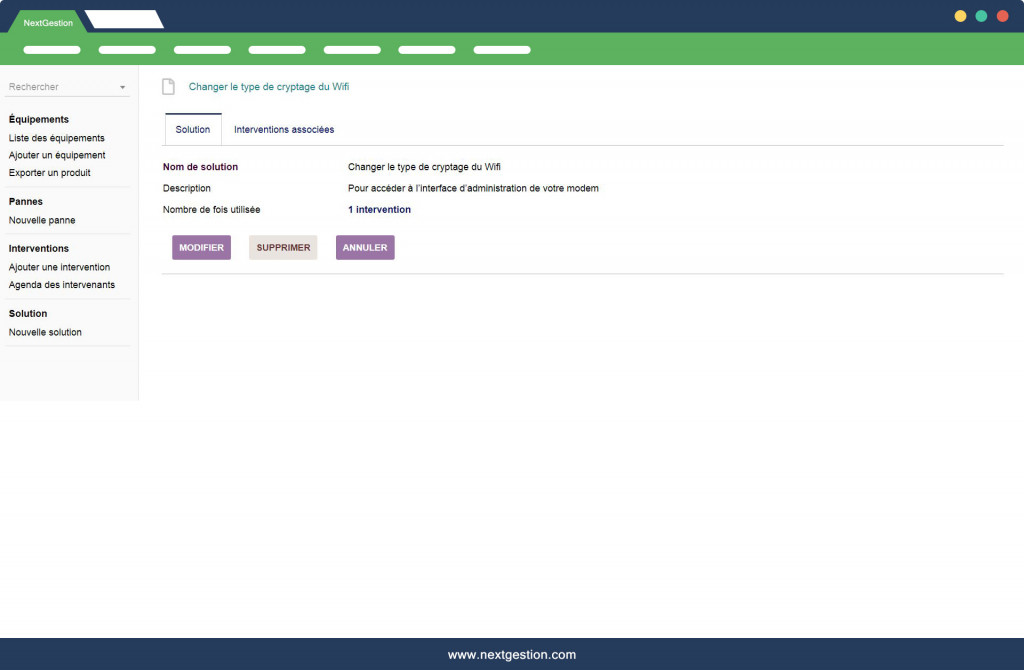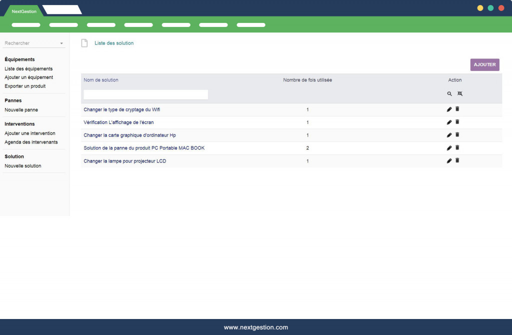 Il modulo di gestione delle attrezzature della flotta, nonché i guasti di Interventi e soluzioni, consente di fornire le seguenti funzionalità: - Introdurre l'elenco delle attrezzature e dei prodotti della tua azienda al fine di gestirli - Presentare gli interventi, i guasti e le soluzioni realizzati su ogni apparecchiatura.